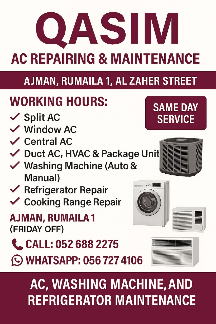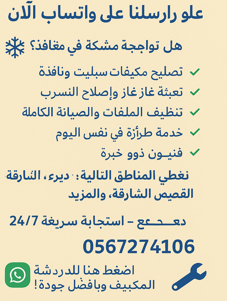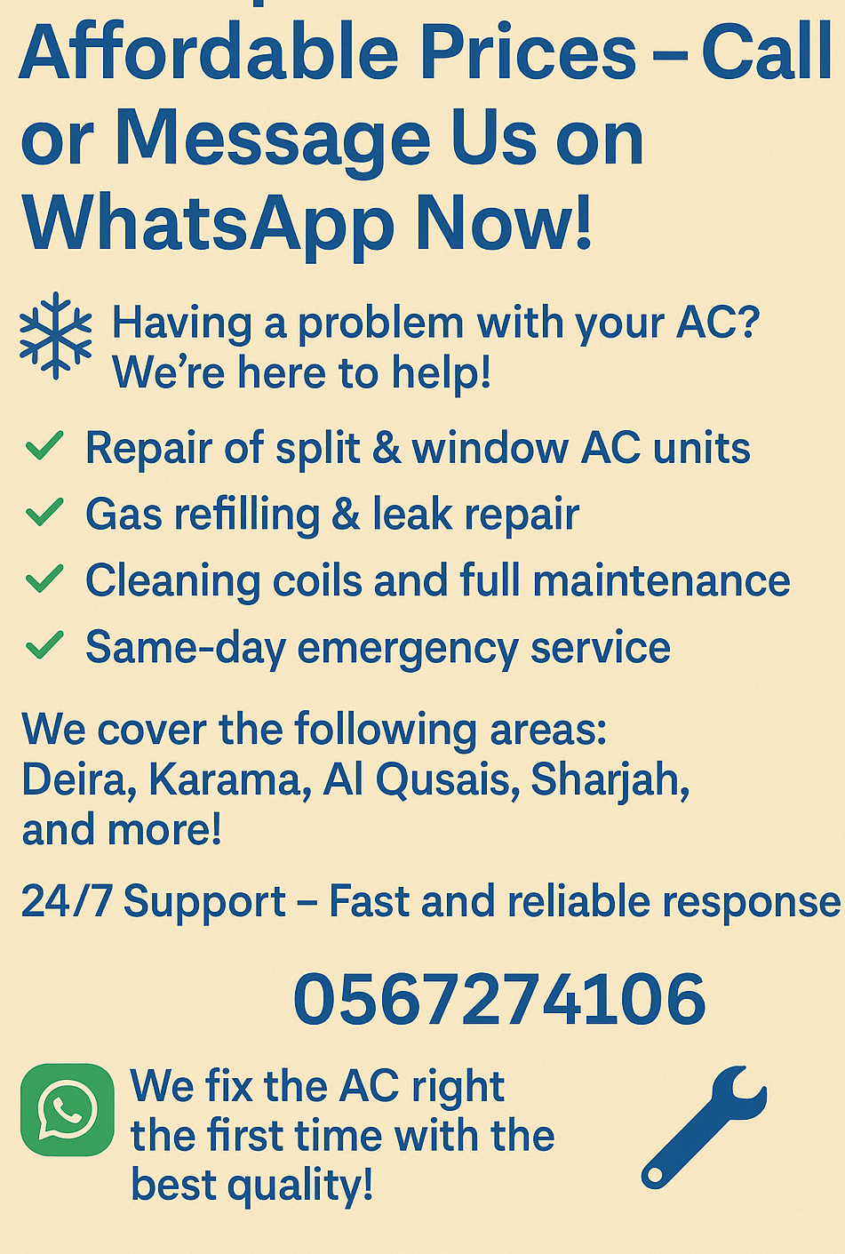 هل تبحث عن خدمات موثوقة في تصليح وصيانة المكيفات في دبي؟ نحن نوفر حلول تكييف الهواء السريعة والمهنية وبأسعار مناسبة للمنازل والمكاتب والأماكن التجارية. سواء كان المكيف بحاجة إلى تعبئة غاز، تنظيف عميق، تركيب جديد أو صيانة طارئة — ففريقنا من الفنيين ذوي الخبرة جاهز لخدمتك. رضا العملاء هو أولويتنا القصوى — ابقَ مرتاحًا وباردًا مع خدمات التكييف الموثوقة في جميع أنحاء دبي.