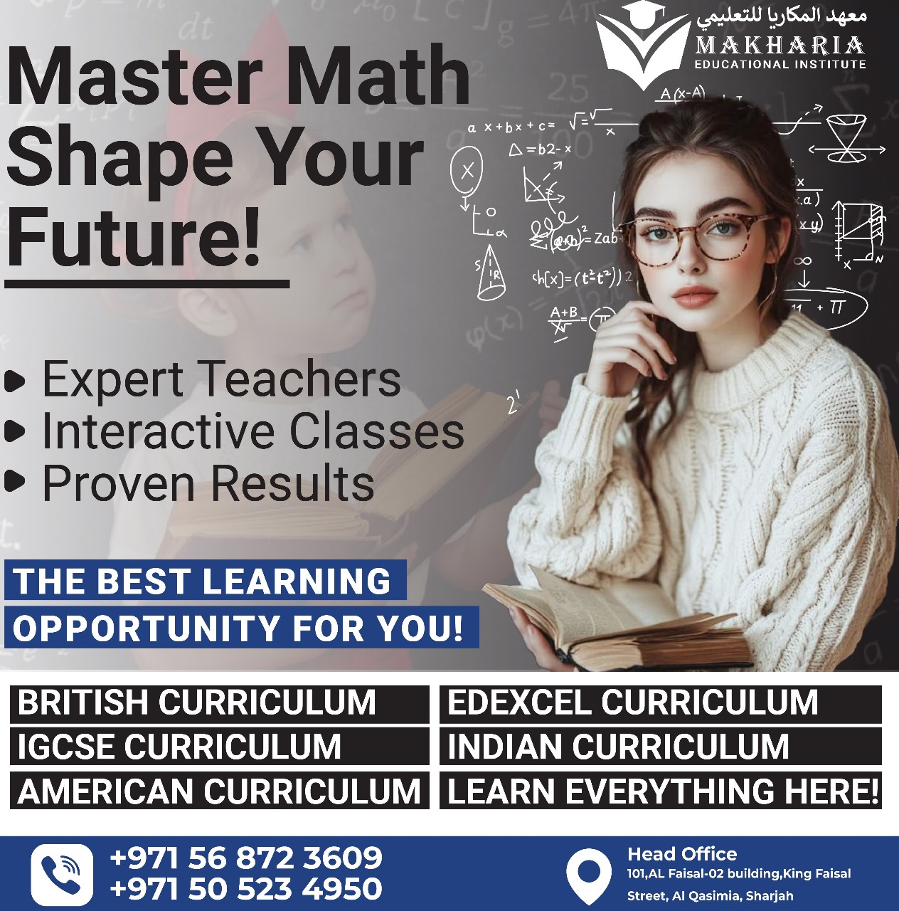 Makharia Institute offers the best math tuition in Sharjah with flexible timings and the choice of online or offline classes. Our experienced math tutors provide step-by-step guidance to make mathematics simple and enjoyable. We specialize in CBSE, British, American, and university-level math, helping students improve grades, sharpen problem-solving skills, and prepare for exams with confidence. Whether you are looking for homework support, exam preparation, or advanced math training, our institute is the right choice. Many parents trust us as the best math tutor near me in Sharjah because of our affordable fees, professional teachers, and personalized learning plans.