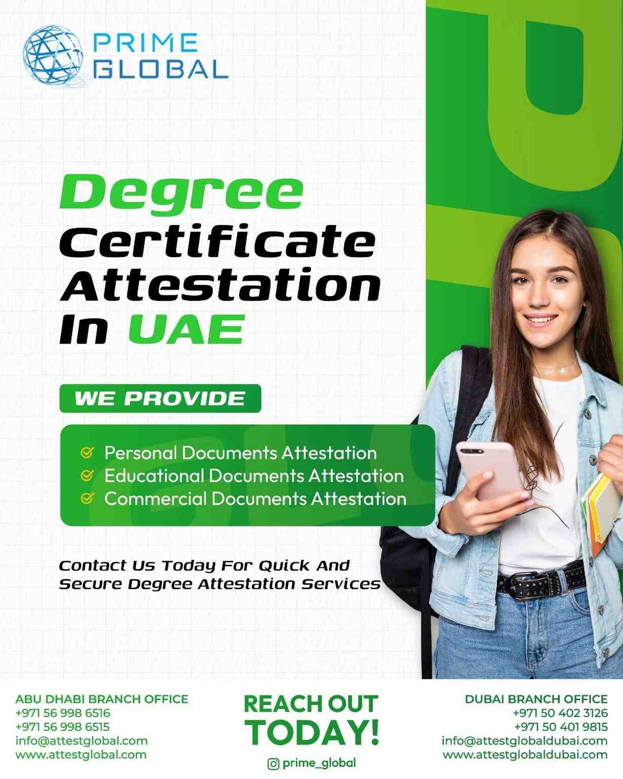 Based in Abu Dhabi, we serve clients across Dubai, Sharjah, and all Emirates, ensuring 100% compliance with UAE regulations. Trust Prime Global Attestation to simplify your academic document attestation with professionalism and care. Contact us today!