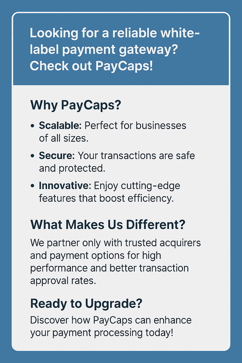 Are you searching for a reliable white-label payment gateway? We understand that finding a good option could be stressful, but we’re here to help you. One of the Best options is ‘Pay Caps’. Perfect for businesses of all sizes, whether you have a small business or a giant empire, we have every type of service. Forget About Vulnerability, Your transactions are safe with our strong focus on security. We provide the latest tools to simplify your operations. We will make you stress Go Away. We stay updated with new Features. We partner exclusively with trusted acquirers to ensure reliability and higher transaction approval rates. Our goal is to support you as the market evolves. If you’re looking for better transaction efficiency and seamless integration, Pay Caps is here for you. Let’s enhance your payment processing together!