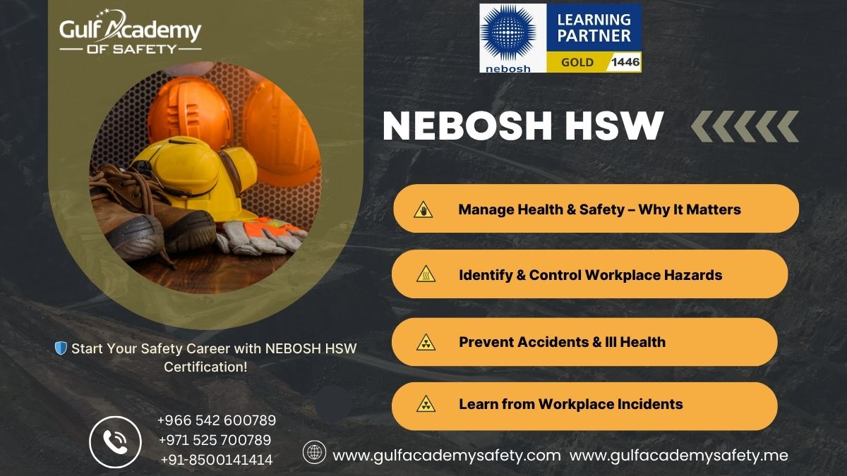 Master the essentials of health and safety with the NEBOSH Health and Safety at Work (HSW) qualification. This introductory course is perfect for team leaders, supervisors, and anyone needing a clear, practical understanding of risk management. You’ll learn to identify common workplace hazards, support risk assessments, and help create a safer working environment for everyone. The NEBOSH HSW Certificate is globally recognized, providing a strong foundation for your career. The content is accessible, making it ideal for those new to the subject. Don’t just meet safety standards—help set them. Enroll in the NEBOSH HSW Course today and become your workplace’s safety champion!