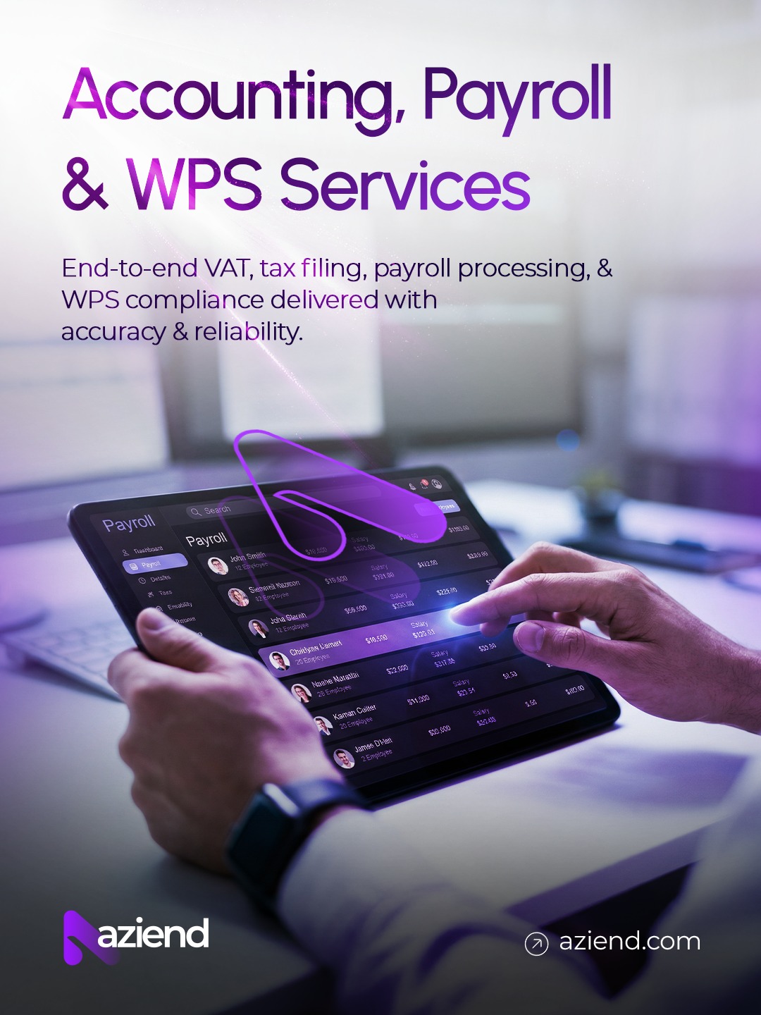 The operations of Aziend are driven by our long-term experience in the UAE market and professionalism in the accounting industry, finance, compliance and project management. The professionals in our team include Certified Public Accountants, Chartered Financial Analysts, Certified Anti-Money Laundering Specialists and Project Management Professionals with expertise across financial reporting, tax compliance, investment analysis, AML/CFT requirements and transformation project delivery.