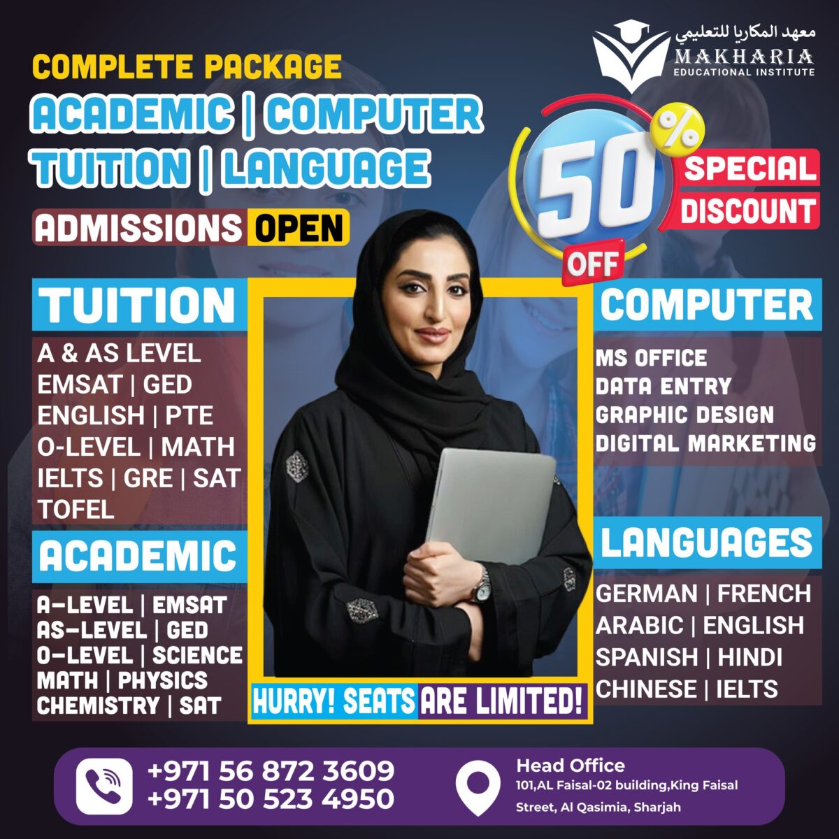 #SharjahEducation, #MakhariaInstitute, #TuitionSharjah, #ComputerCoursesUAE, #LanguageClassesUAE, #IELTSPrep, #AcademicSupport, #SkillUpUAE, #StudyInSharjah, #EnrollNow, #LimitedOffer, #CareerReady, #StudentLifeSharjah, Academic Coaching Sharjah, Computer Training Sharjah, Language Learning UAE, IELTS Classes Sharjah, Tuition Center Sharjah, Education in UAE, Discounted Courses Sharjah, Skill Development UAE,