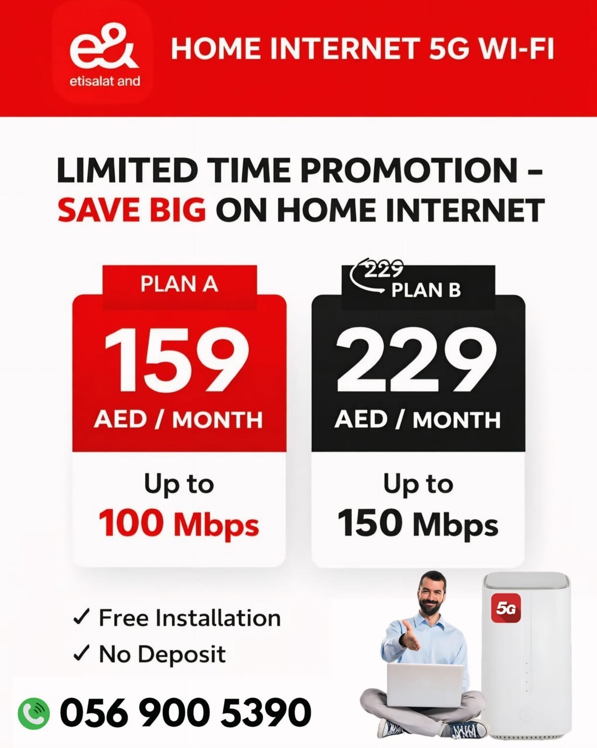Etisalat Home Wifi 5G AED 159 Routers Report problemProcessing your request, Please wait....Offensive ContentInvalid OfferSpamOther× Home Free Classifieds Computers & Networking Networking & Communication Routers Etisalat Home Wifi 5G Etisalat Home Wifi 5G February 4, 2026 AED 159 Verified & Active Photo Gallery Etisalat Home Wifi 5G × Additional Info Contact WhatsApp Call Now Location United Arab Emirates City Dubai Country United Arab Emirates Age Brand New Accessories Brand Other Usage Still in original packaging Condition Perfect inside and out Warranty Yes159 Etisalat WiFi Connection New Offer Free installation More Details 👉https://wa.me/971569005390 Comments ETISALAT Listing Owner Member Since: April 2, 2025 Etisalat Home Wifi Connection Sievers in all UAE NO ADVANCE NO ADVANCE 0569005390 CALL OR WHATSAPP Contact Owner Contact Owner You must be logged in to inquire about this ad. × Share Ad Search Ads All Categories Communities Electronics Free Classifieds Hotels Jobs Motors Others Properties for Rent Properties for sale Vehicles Rental Search Ad Categories Communities 463 Electronics 174 Free Classifieds 1217 Hotels 8 Jobs 95 Motors 64 Properties for Rent 123 Properties for sale 43 Vehicles Rental 47 Share Ad United Arab Emirates Dubai Similar in Free Classifieds View All AED Contact Joinery Dubai and Technical Services LLC AED 599 Luxury Velvet Storage Ottoman Bench – Green AED 199 Same Day Commercial Kitchen Equipment Service in Dubai UAE AED Contact Washing Machine Repair in Dubai & Sharjah – FAJ Technical Services L.L.C AED 10,000 Healthcare Management System for Efficient Hospital Operations AED 100 Weekly Maid Services Dubai | Quality Cleaning You Deserve AED 100 MEF Industrial Tools Suppliers in UAE AED 0 Justlife Ramadan 2026 Offers: Simplify Your Home & Wellness with Seasonal Savings AED 159 Etisalat home WiFi internet connection AED Contact AC Duct Cleaning in Abu Dhabi – Duct Technical Works LLC