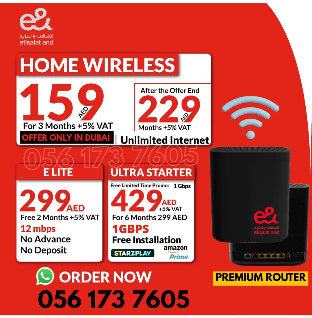home wireless etisalat is available in 159 for 3months discount is availableMessage Muhammad Etisalat on WhatsApp. https://wa.me/971561737605