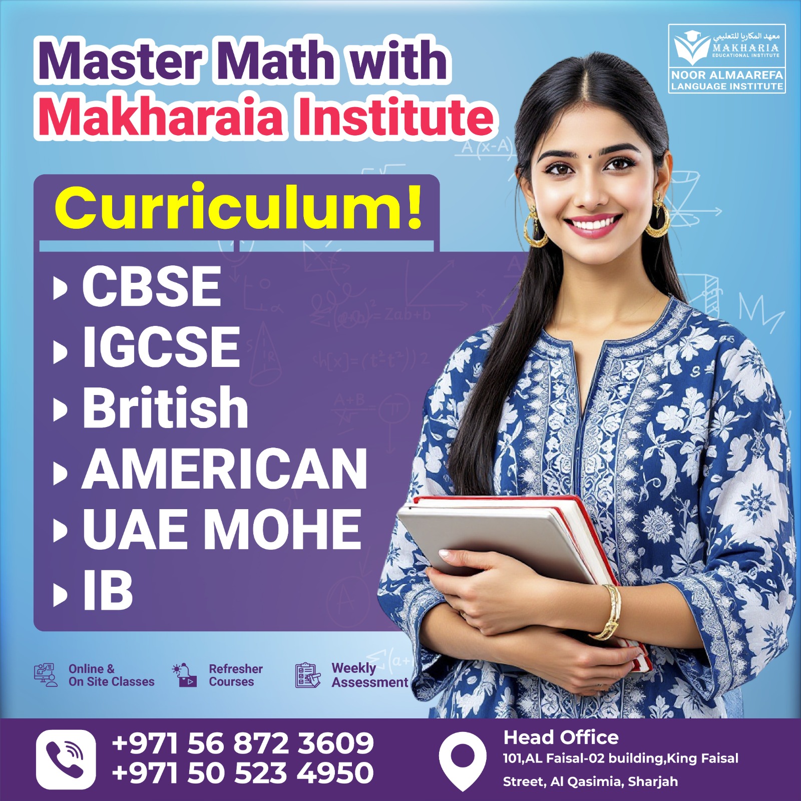 Makharia Institute offers the best math tuition in Sharjah with flexible timings and the choice of online or offline classes. Our experienced math tutors provide step-by-step guidance to make mathematics simple and enjoyable. We specialize in CBSE, British, American, and university-level math, helping students improve grades, sharpen problem-solving skills, and prepare for exams with confidence. Whether you are looking for homework support, exam preparation, or advanced math training, our institute is the right choice. Many parents trust us as the best math tutor near me in Sharjah because of our affordable fees, professional teachers, and personalized learning plans.