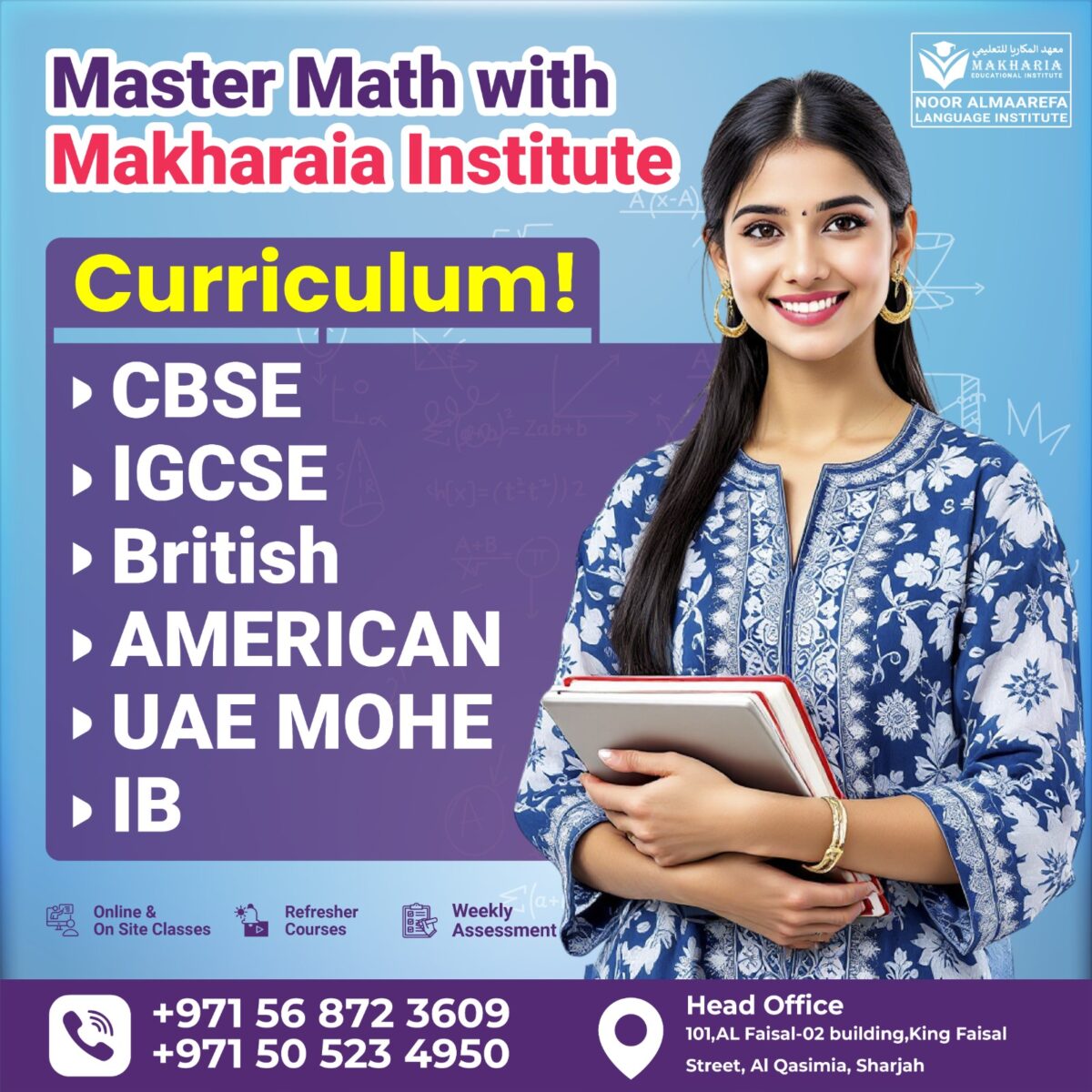 Makharia Institute offers the best math tuition in Sharjah with flexible timings and the choice of online or offline classes. Our experienced math tutors provide step-by-step guidance to make mathematics simple and enjoyable. We specialize in CBSE, British, American, and university-level math, helping students improve grades, sharpen problem-solving skills, and prepare for exams with confidence. Whether you are looking for homework support, exam preparation, or advanced math training, our institute is the right choice. Many parents trust us as the best math tutor near me in Sharjah because of our affordable fees, professional teachers, and personalized learning plans.