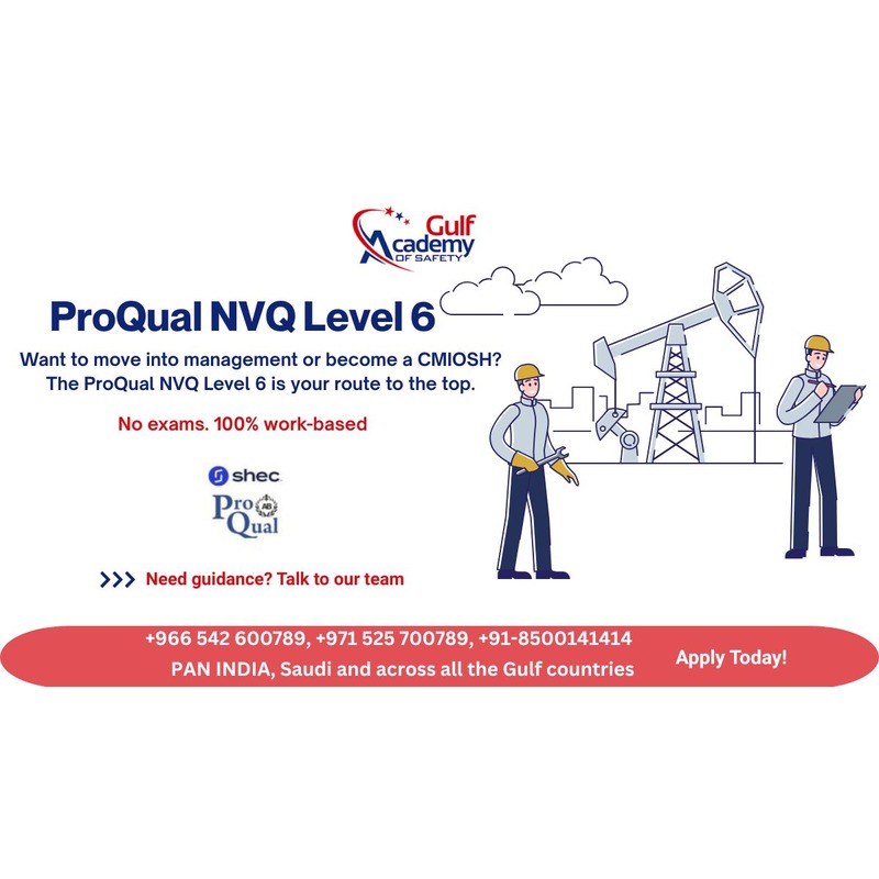 Take your health and safety career to the next level with the ProQual NVQ Level 6 Diploma, available 100% online at Gulf Academy Safety. This Level 6 qualification is ideal for experienced professionals aiming for senior roles and IOSH Chartered Membership (CMIOSH). With no exams, the course is assessed through real-world evidence, allowing flexible learning around your job. Our expert assessor support and user-friendly platform make the process simple and efficient. Enroll in the NVQ Level 6 Online Course today and gain a globally recognised qualification that proves your leadership in health and safety management.