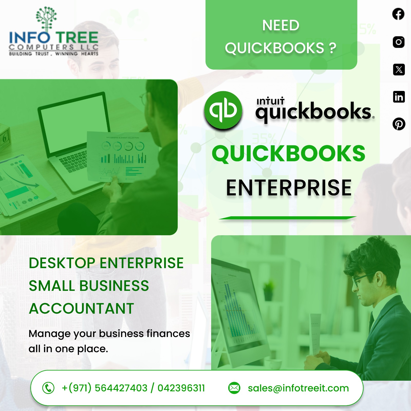 Infotreeit is providing the best QuickBooks software. Get original QuickBooks Desktop Enterprise software in the UAE for growing businesses. Now available in the UAE with genuine licensing, it features advanced inventory management, payroll capabilities, multi-user access, and industry-specific functionalities. Ideal for retail, manufacturing, and service companies.